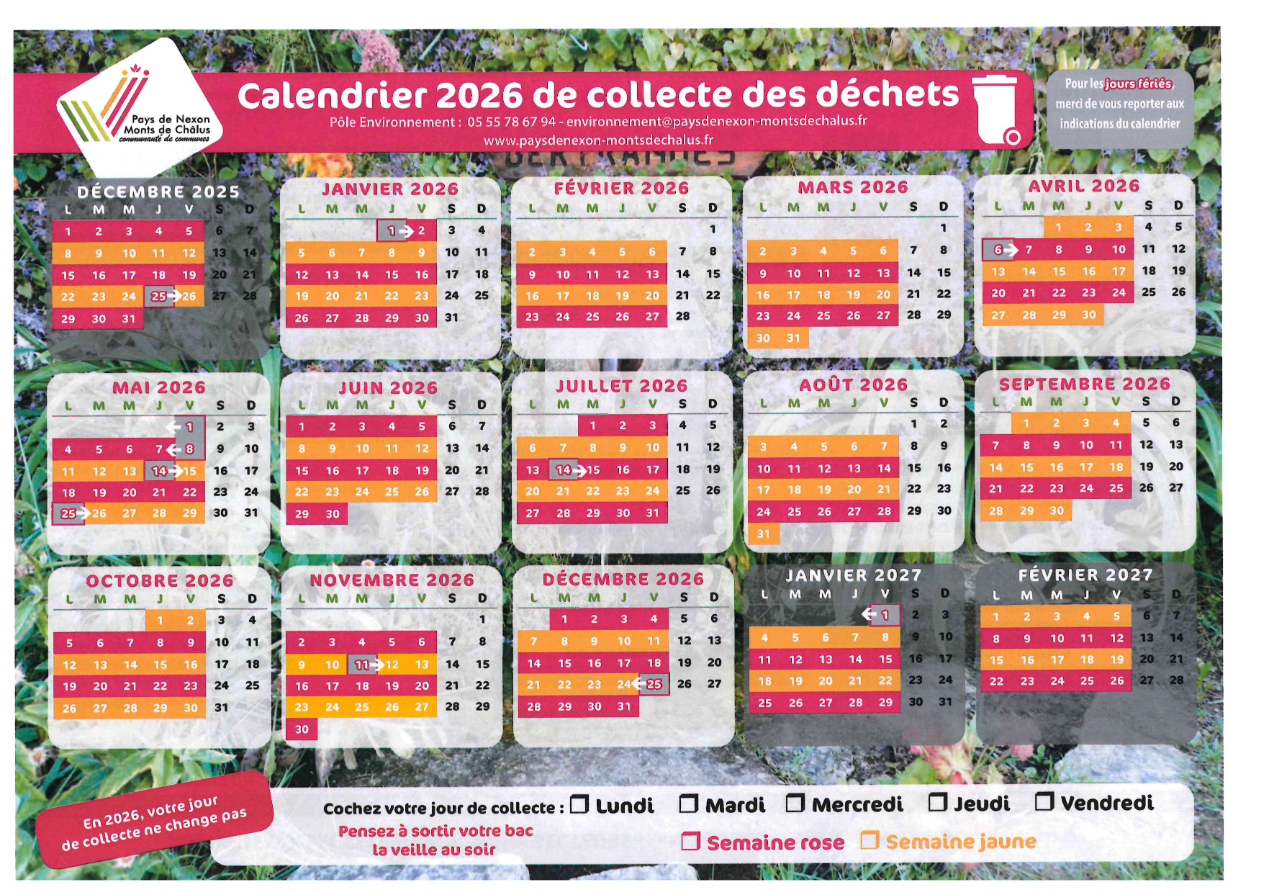 Calendriers jours de collecte des ordures ménagères :